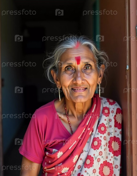 Пожилая женщина стоит у дверей, надев красочное сари, украшенное цветочными узорами. Ее теплая улыбка и приветливая природа излучают радость в ее индийской деревне
