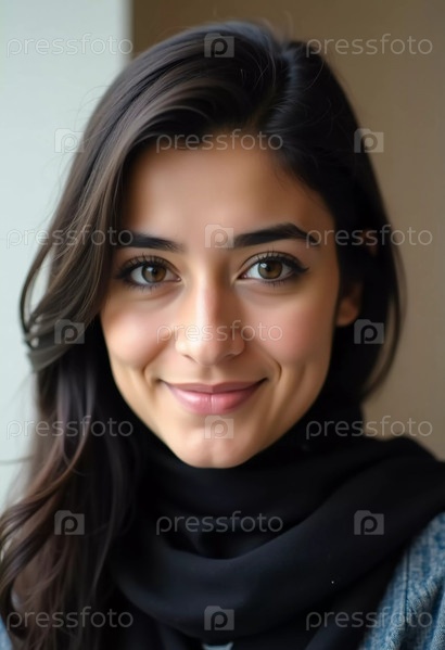 Молодая палестинская женщина тепло улыбается, ее темные волосы каскадируют на ее плечах. Одетая в традиционный шарф, она излучает уверенность и изящество в мягко освещенном помещении
