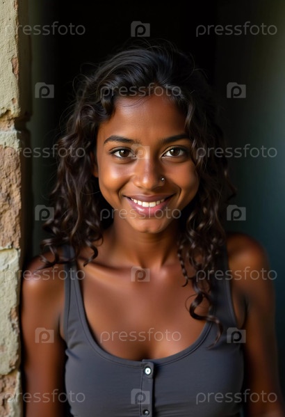 Молодая индейка уверенно стоит у двери, ее изогнутые волосы обрамляют ее сияющее лицо.Солнечный свет освещает её особенности, создавая привлекательную атмосферу Generative AI