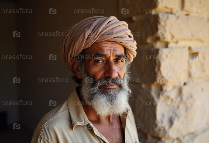 Безмятежный пожилой человек из Йемена стоит с вдумчивым выражением, его выветренные черты светятся ранним утренним светом на фоне текстурированных каменных стен Генеративный ИИ