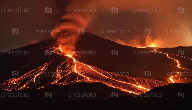 Магма бурно течет по вулканическим склонам, воспламеняя окружающую темноту