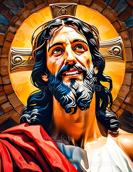 В прекрасный момент Иисус Христос мягко улыбается, освещен теплым золотым светом на фоне камня.Его радостное выражение приглашает к размышлению и миру Generative AI