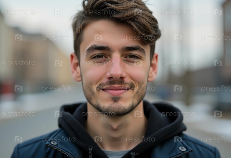 Молодой белорусский мужчина уверенно стоит на мирной улице, надев повседневную куртку и приветливую улыбку
