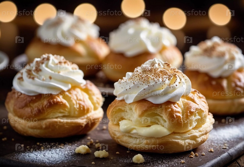 Тарелка свежеприготовленных пирожных, каждая из которых увенчана порошкообразным сахаром и кремовой начинкой, красиво устроена в мягком вечернем свете, приглашая любителей десерта побаловать себя. Генерирующий ИИ