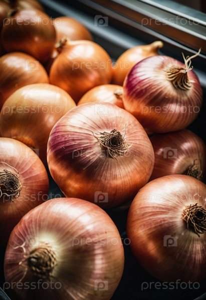 Разнообразие свежего, большого лука аккуратно устроено на прилавке супермаркета, демонстрируя их блестящую, коричневую кожу и приглашая покупателей выбрать их для приготовления пищи. Генеративный ИИ