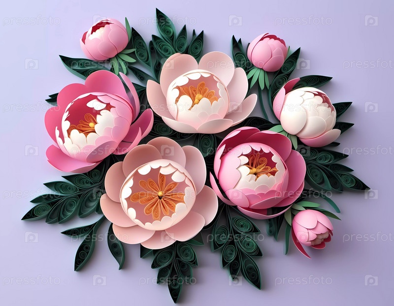 Букет бумажных пионов ручной работы в оттенках розового с подробными лепестками и пышными зелеными листьями искусно расположен на мягком фиолетовом фоне, создавая потрясающий визуальный дисплей. Генерирующий ИИ
