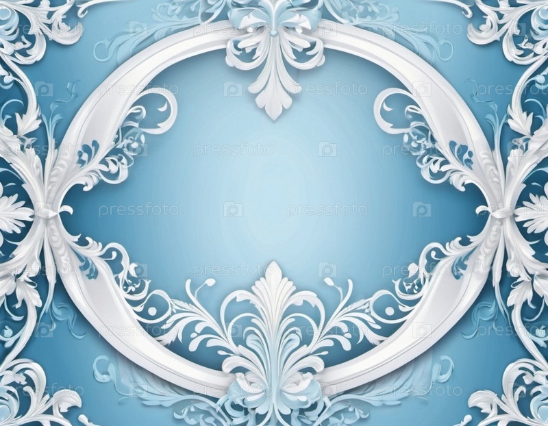 Каркас с белыми декоративными листьями и цветами в стиле рококо-барокко. Нежные мягкие элементы пастельного светло-голубого фона. Сложные детали листьев, нежная красота. Копируйте пространство. Сгенерированный ИИ