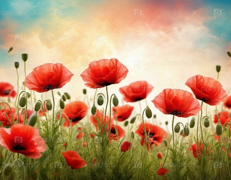 Красные маки, зеленые листья, стебли. Щенки изображены на различных стадиях цветения, причем некоторые полностью открыты, а другие в зародыше. Мягкая спина, создающая нежные романтические чувства. Копируйте пространство. Открытка или макет