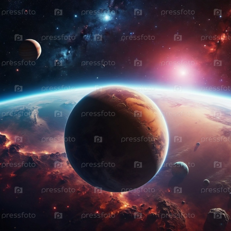 Планетарная система с несколькими планетами, большой ярко окрашенный газовый гигант и скалистая планета. Яркие звезды и обширное пространство темного пространства с галактикой на заднем плане. Космические пространства. Космонавтика. ИИ