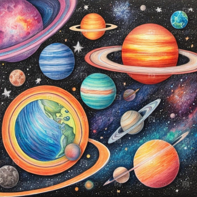 Планетарная система с несколькими планетами, большой ярко окрашенный газовый гигант и скалистая планета. Яркие звезды и обширное пространство темного пространства с галактикой на заднем плане. Космические пространства. Космонавтика. ИИ