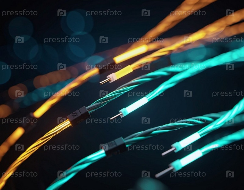 Синие и оранжевые светящиеся провода скручиваются и переплетаются на темном фоне с боке. Черные кабели и разъемы со светящимися огнями и цепями соединяются, чтобы сформировать сеть. генерируемый