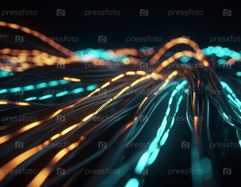 Синие и оранжевые светящиеся провода скручиваются и переплетаются на темном фоне с боке. Черные кабели и разъемы со светящимися огнями и цепями соединяются, чтобы сформировать сеть. генерируемый
