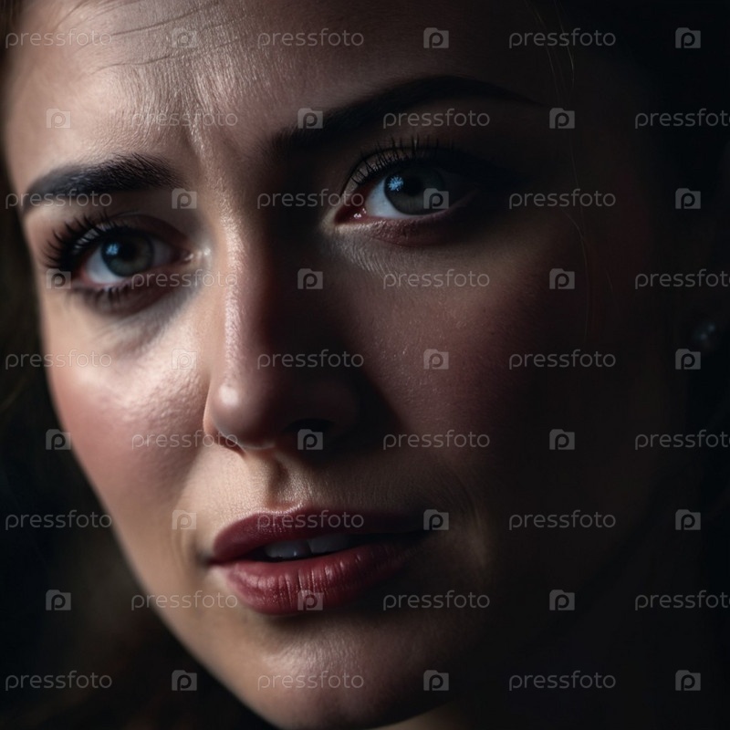 Женщина с нахмуренными бровями и обеспокоенным выражением лица смотрит прямо в камеру. Освещение тусклое, отбрасывая тени вокруг лица, подчеркивая ее стресс. Страх, разочарование, расстройство, беспокойство и вдумчивость. ИИ