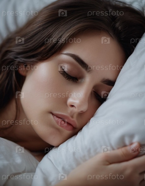 Брюнетка с длинными ресницами мирно спит на кровати, демонстрируя безмятежный момент в ранние утренние часы. Женщина-брюнетка крепко спит на подушке. Спокойствие и спокойствие. Искусство. Утро