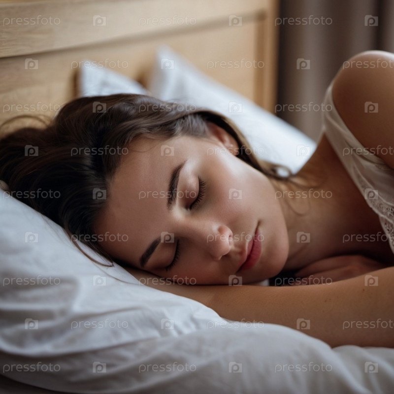 Брюнетка с длинными ресницами мирно спит на кровати, демонстрируя безмятежный момент в ранние утренние часы. Женщина-брюнетка крепко спит на подушке. Спокойствие и спокойствие. Искусство. Доброе утро