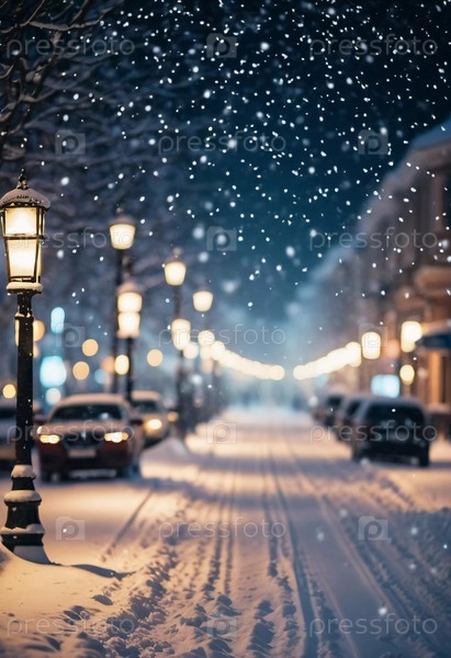 Зима приносит мягкий снегопад на городские улицы, где над головой висят красочные огни, создавая теплую и праздничную атмосферу. Эффект боке от огней добавляет причудливого прикосновения, подчеркивая радость сезона