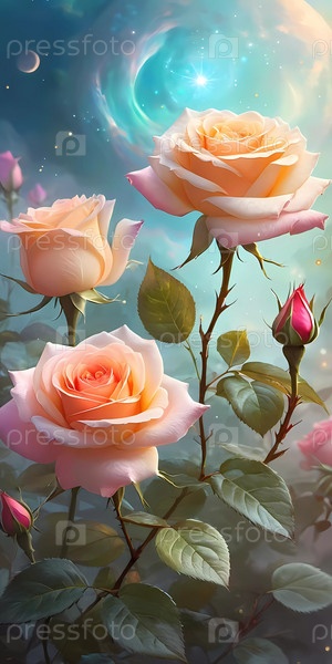 Потрясающая романтическая картина с изящными розовыми и персиковыми розами, цветущими под мягким небесным небом, с сияющим закатом, освещающим сцену. Луна и звезды, вызывающие чувство безмятежности и любви. ИИ
