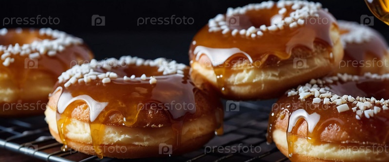 Пачка медовых глазурованных пончиков с глянцевым карамельным покрытием, украшенных хрустящими начинками, приглашая вас побаловать себя сладким угощением. Эти пончики идеально подходят для любого любителя десертов. Генерирующий ИИ