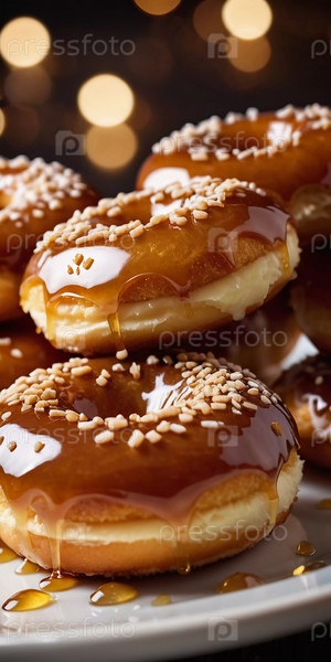 Пачка медовых глазурованных пончиков с глянцевым карамельным покрытием, украшенных хрустящими начинками, приглашая вас побаловать себя сладким угощением. Эти пончики идеально подходят для любого любителя десертов. Генерирующий ИИ