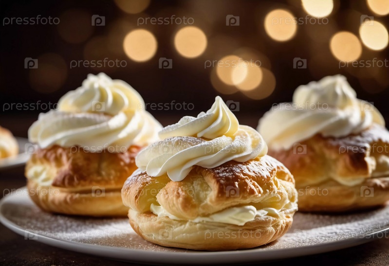 Тарелка свежеприготовленных пирожных, каждая из которых увенчана порошкообразным сахаром и кремовой начинкой, красиво устроена в мягком вечернем свете, приглашая любителей десерта побаловать себя. Генерирующий ИИ