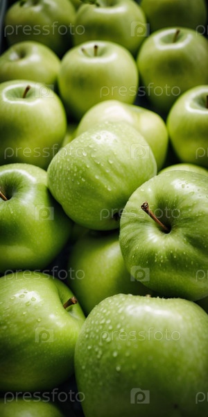 Красочный ассортимент зеленых яблок аккуратно устроен на прилавке супермаркета, приглашая клиентов исследовать и выбирать свежие фрукты. Генерирующий ИИ
