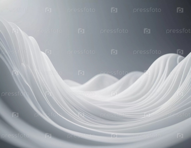 Плавучие 3D-волны в белом и сером цвете создают увлекательный абстрактный рисунок с гладкими кривыми и световым градиентом на темном фоне, который вызывает артистизм и спокойствие