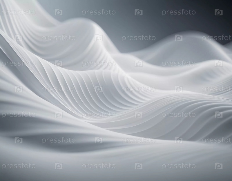 Плавучие 3D-волны в белом и сером цвете создают увлекательный абстрактный рисунок с гладкими кривыми и световым градиентом на темном фоне, который вызывает артистизм и спокойствие