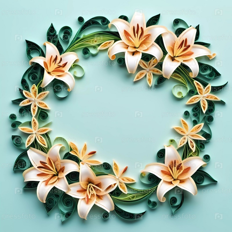 Нежные белые лилии и замысловатые зеленые листья образуют потрясающий цветочный венок, демонстрирующий артистизм на мягком синем фоне. Идеально подходит для украшения или вдохновения. Генерирующий ИИ