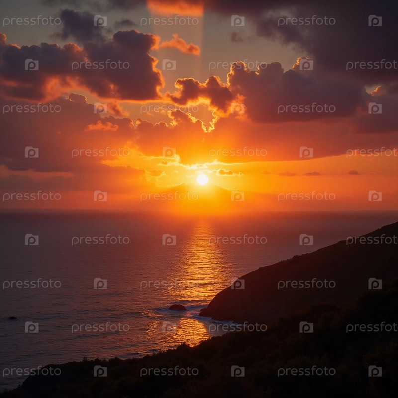 Потрясающий восход солнца купает океан в ярком красном свете, поскольку облака отражают цвета выше. Волны мягко обходят берег, создавая мирную атмосферу на рассвете. Влажность дымится над водой. Генерирующий ИИ