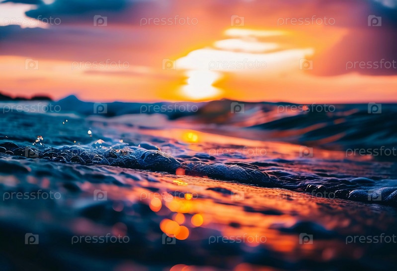 Солнце поднимается над океаном, отбрасывая теплые оттенки через воду. Волны мягко катятся, создавая пузырьки, которые сверкают в раннем свете, в то время как облака пронизывают небо яркими цветами. Генеративный ИИ
