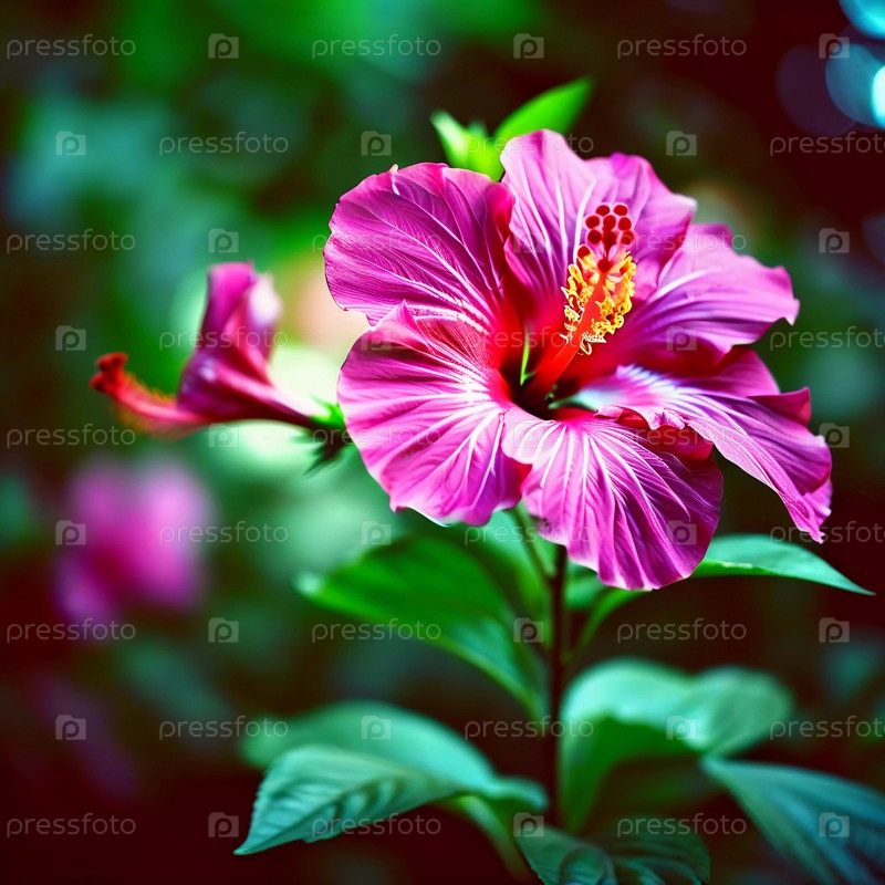 Ярко-красные цветы гибискуса демонстрируют сложные листья в цветущем саду. Прекрасная зелень создает яркий фон для их красоты. Гибискус является крупным родом растений из семейства Malvaceae