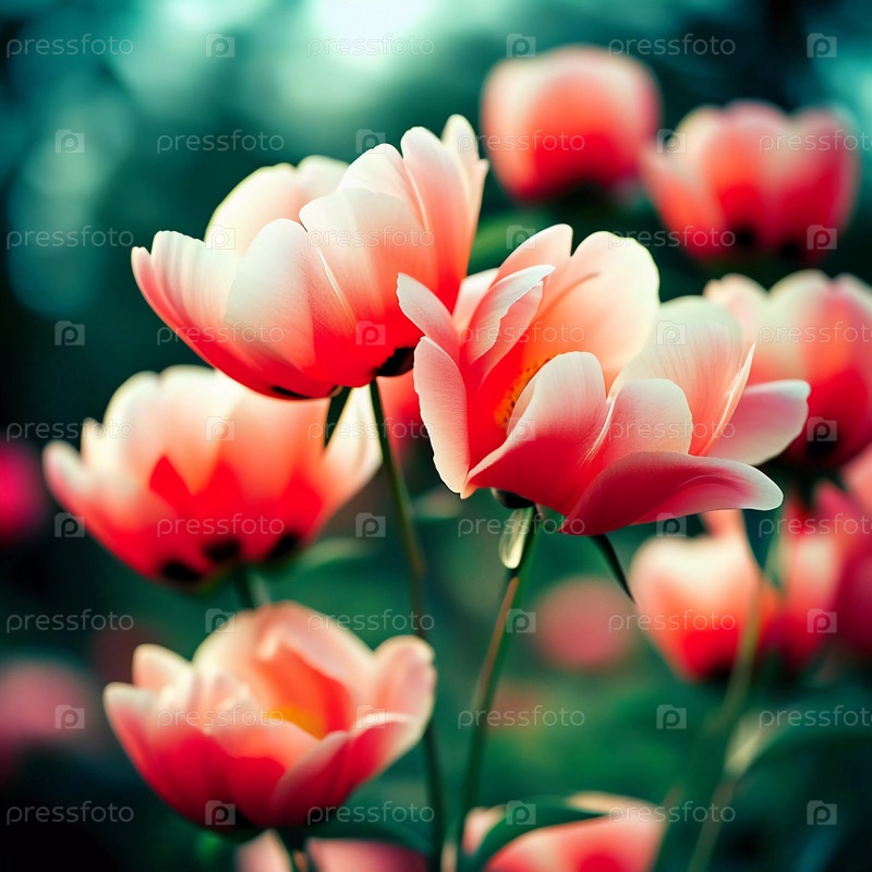 Поле тюльпанов греется в золотом солнечном свете сумерек, демонстрируя яркие оттенки белого и красного, когда цветы широко открываются. Сцена отражает суть весенней красоты. Генеративный ИИ