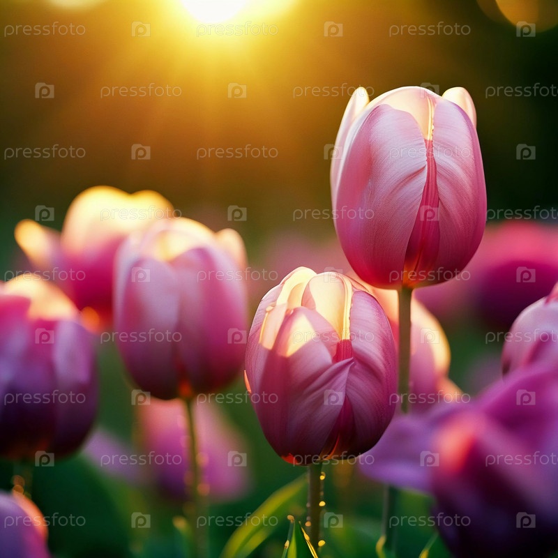 Поле тюльпанов греется в золотом солнечном свете сумерек, демонстрируя яркие оттенки фиолетового и сиреневого, когда цветы широко открываются. Сцена отражает суть весенней красоты. Генерирующий ИИ
