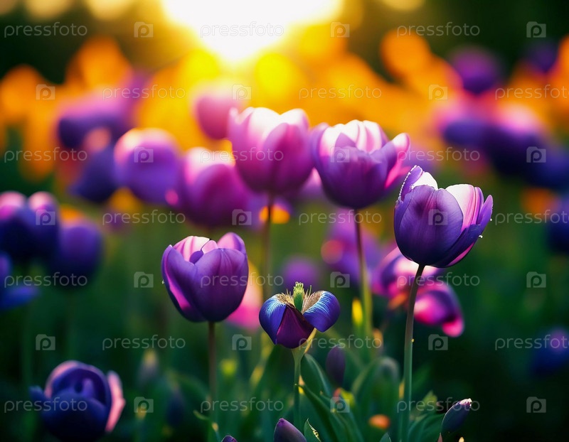 Поле тюльпанов греется в золотом солнечном свете сумерек, демонстрируя яркие оттенки фиолетового и сиреневого, когда цветы широко открываются. Сцена отражает суть весенней красоты. Генерирующий ИИ