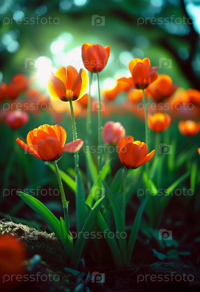Поле тюльпанов греется в золотом солнечном свете сумерек, демонстрируя яркие оттенки оранжевого и желтого, когда цветы широко открываются. Сцена отражает суть весенней красоты. Генерирующий ИИ