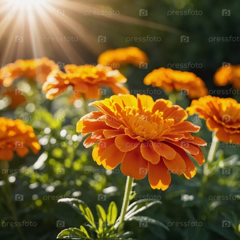 Цветы Маригольд демонстрируют богатые оранжевые оттенки в саду, освещенные теплым солнечным светом, создавая оживленную атмосферу