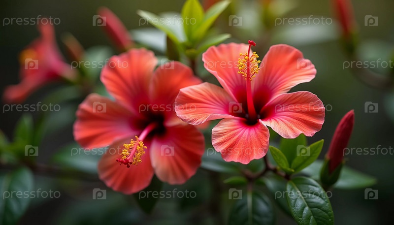 Ярко-красные цветы гибискуса демонстрируют сложные листья в цветущем саду. Прекрасная зелень создает яркий фон для их красоты. Гибискус является крупным родом растений из семейства Malvaceae