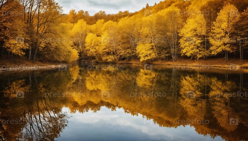 Яркие желтые листья создают потрясающий осенний дисплей вокруг спокойного озера, с отражениями, отражающими листву на поверхности воды, когда день подходит к концу. Генерирующий ИИ