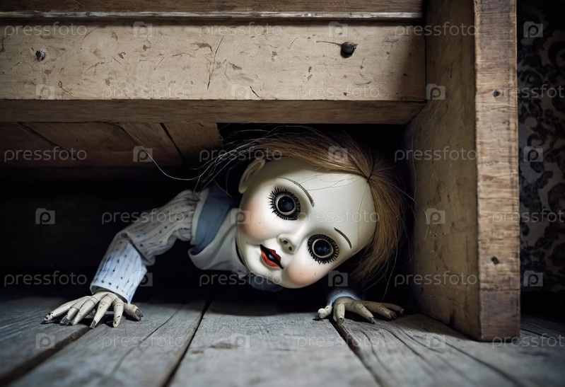 Тревожная старая кукла с преследующими глазами и винтажной одеждой выскочила из-под ретро-кровать, вызывая жуткое чувство в тускло освещенном пространстве. Страшная кукла для ужасов и Хэллоуина. Генеративный ИИ