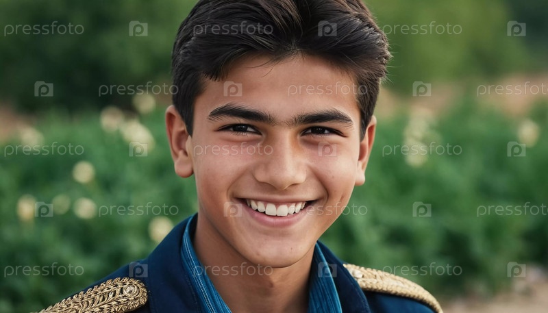 Радостный симпатичный таджикский мальчик 18 лет сияет от счастья, стоя в живописном пейзаже, окруженном красотой природы во время теплого, золотого часового света. Счастливый улыбающийся брюнет. генерируемый