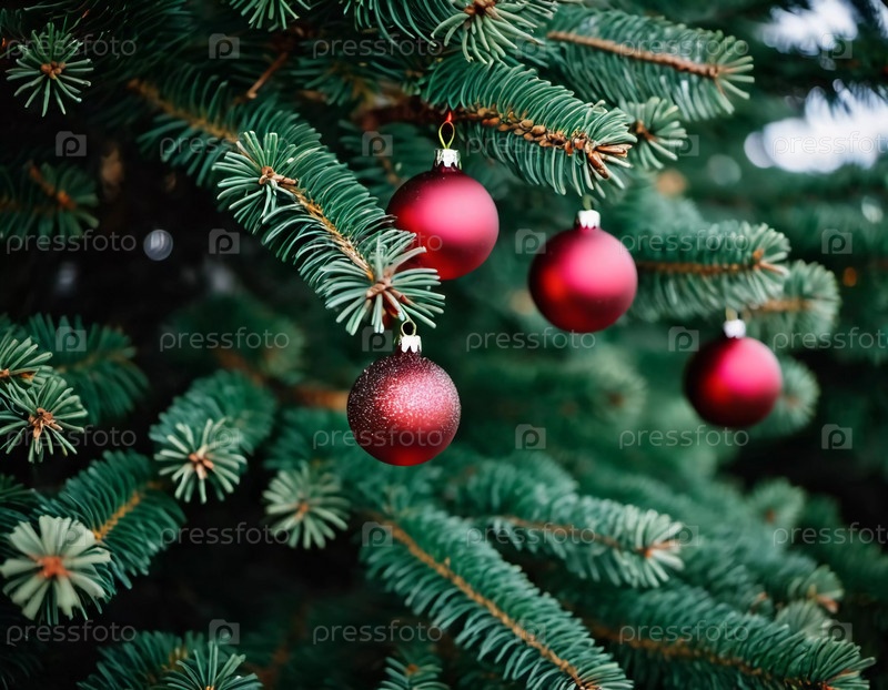 Красочные рождественские украшения украшают ветви елки, яркие шары в оттенках красного и розового, олицетворяющие праздничное настроение зимой. С Новым годом искусство боке фон. Генерирующий ИИ