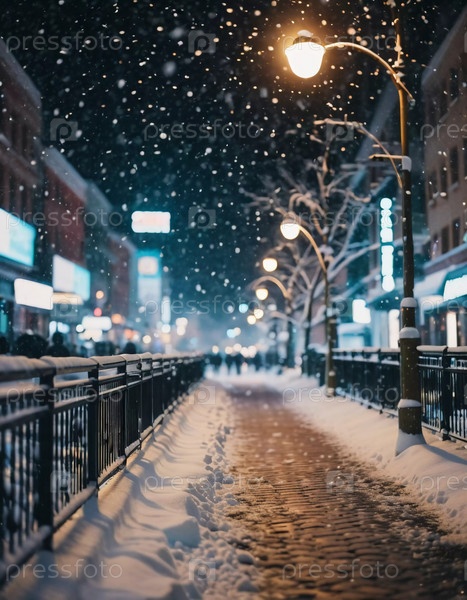 Тихий зимний вечер окутывает городскую улицу, где мягко падающий снег усиливает свечение рождественских огней. Праздничная атмосфера привлекает людей, празднующих Новый год. Генеративный ИИ