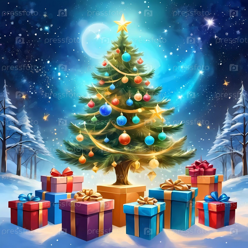 Украшенная рождественская елка, украшенная красочными украшениями и уложенными подарками, готова к празднованию в уютной праздничной обстановке. Обернутые подарки различных цветов. Праздничная атмосфера, тепло и радость. ИИ