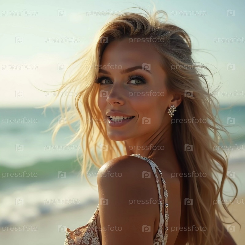 Блондинка в купальнике смотрит назад, стоя у береговой линии. Нежные морские волны лазают у ее ног под ясным голубым небом. Длинные волосы, красивое молодое лицо. Реклама путешествий и одежды. ИИ