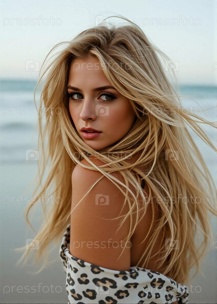 Блондинка в купальнике смотрит назад, стоя у береговой линии. Нежные морские волны лазают у ее ног под ясным голубым небом. Длинные волосы, красивое молодое лицо. Реклама путешествий и одежды. ИИ