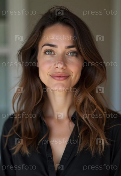 Французская кавказская красивая молодая жительница с волнистыми волосами разделяет подлинную улыбку, стоя в помещении, освещенном естественным светом, создавая притягательную атмосферу. Генерирующий ИИ