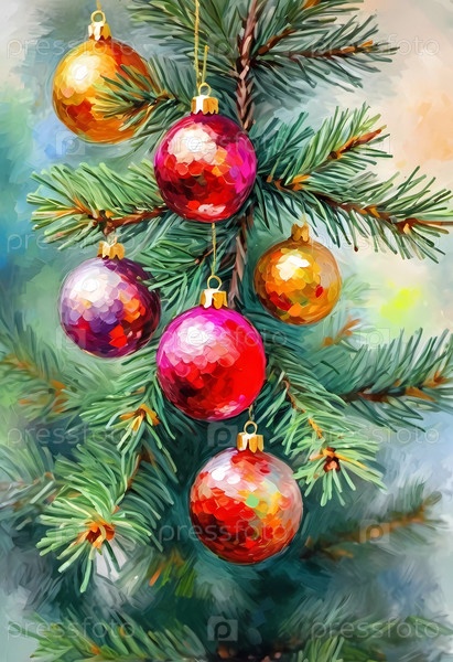 Искрометные орнаментные шары в ярком красном и золотом свисают с пышной ветки елового дерева. Мягкие, теплые огни мерцают, усиливая праздничный дух Рождества. С Новым годом. Художественный рисунок. Генерирующий ИИ