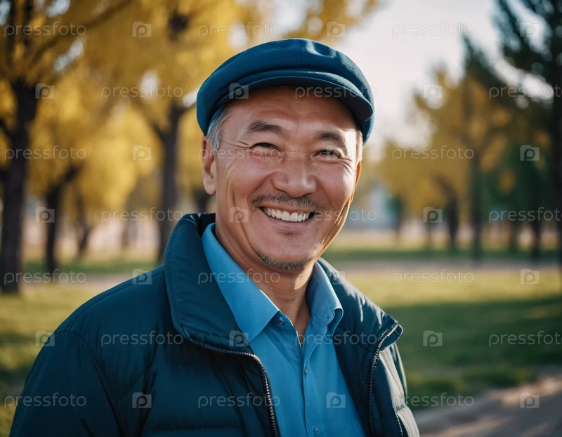 Мужчина 50 лет с искренней улыбкой стоит на улице в оживленном районе, демонстрируя дружелюбное поведение и наслаждаясь прекрасным днем среди яркой обстановки. Житель Казахстана. генерируемый
