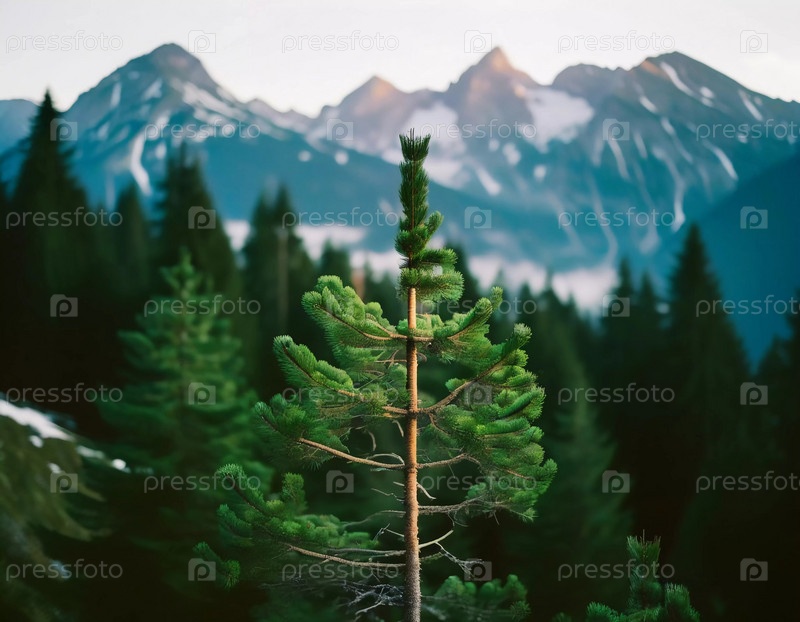 Величественные горы возвышаются над безмятежным еловым лесом под драматическим небом, демонстрируя красоту природы в сумерках. Высокие горы с холмами и угрюмым небом, освещающим мирную пустыню. ИИ
