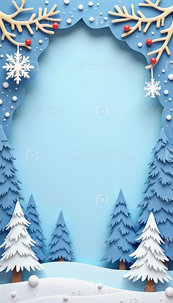 В зимней сцене ручной работы представлены тонкие бумажные вырезанные конструкции покрытых снегом деревьев и замысловатые снежинки на мягком синем фоне для праздничного декора. Новый год, Рождество. Генерирующий ИИ